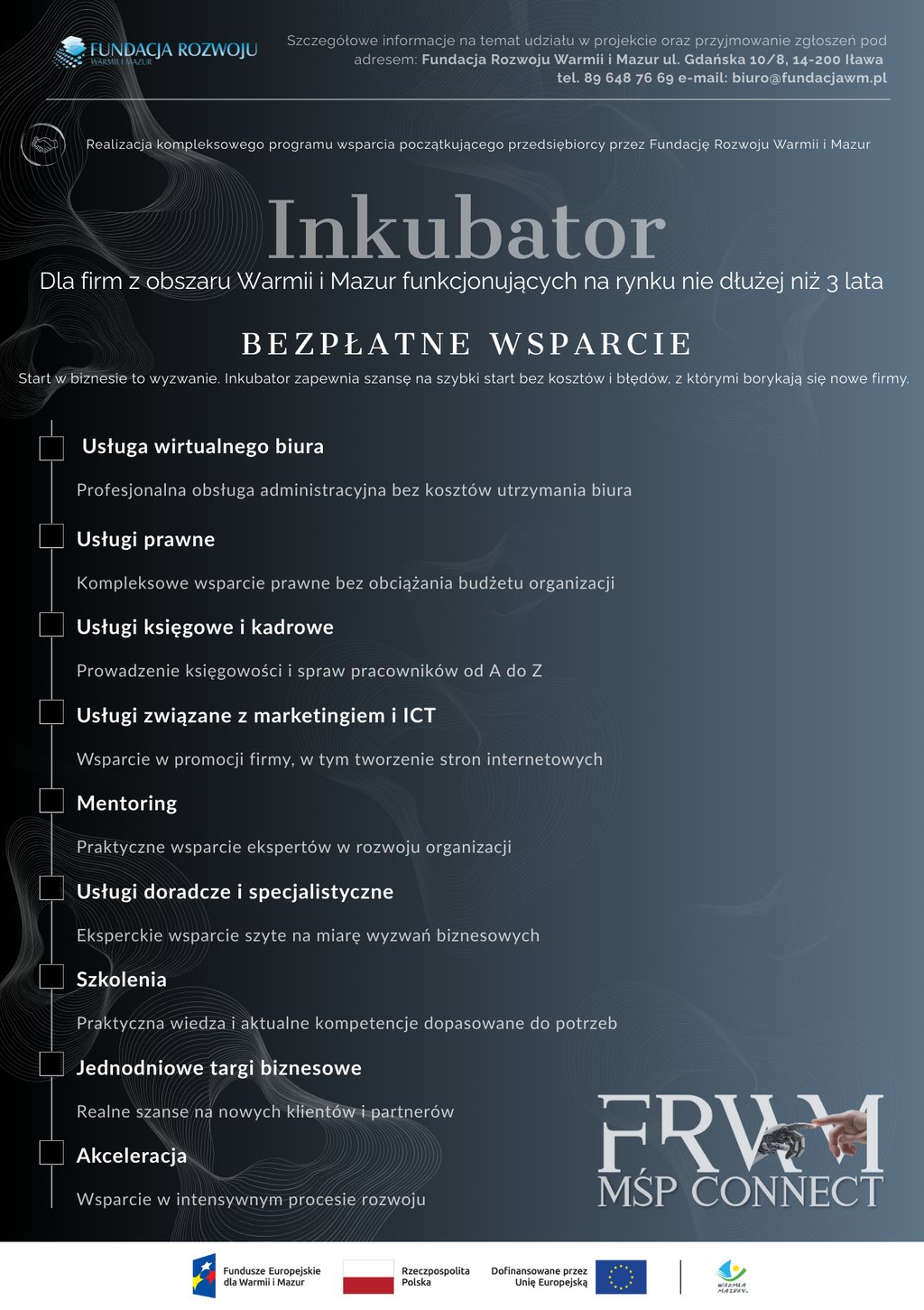Fundacja Rozwoju Warmii i Mazur realizuje projekt "Realizacja kompleksowego programu wsparcia początkującego przedsiębiorcy przez Fundację Rozwoju Warmii i Mazur" ze środków Funduszy Europejskich dla Warmii Mazur na lata 2021-2027
