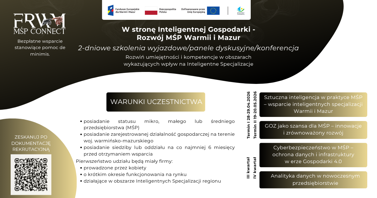Fundacja Rozwoju Warmii i Mazur prowadzi rekrutację do projektu „W stronę Inteligentnej Gospodarki – Rozwój MŚP Warmii i Mazur”, skierowanego do mikro, małych i średnich firm z regionu. Celem inicjatywy jest wsparcie lokalnych firm w budowaniu przewagi konkurencyjnej, wdrażaniu innowacji oraz przygotowaniu do wyzwań Gospodarki 4.0. Ostatnie wolne miejsca - pierwsze szkolenie już 28-29.04.2026!