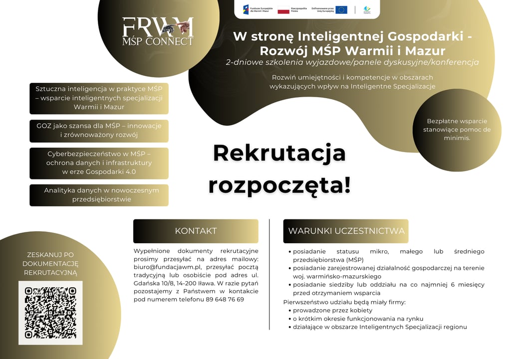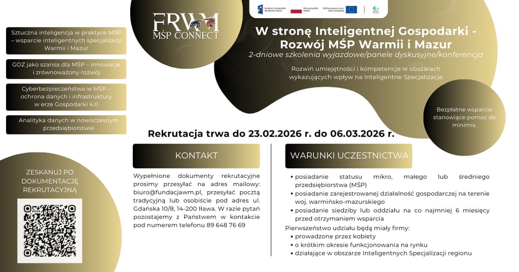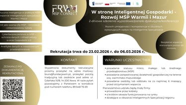 Fundacja Rozwoju Warmii i Mazur otrzymała dofinansowanie ze środków Funduszy Europejskich dla Warmii Mazur na lata 2021-2027 na realizację projektu "W stronę Inteligentnej Gospodarki - Rozwój MŚP Warmii i Mazur".